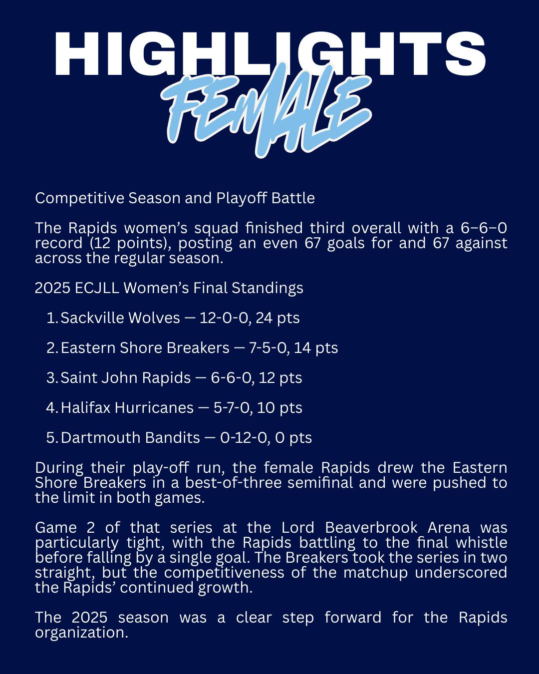 Join us for the Female Rapids Season Home Opener versus the Sackville Wolves